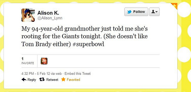 While I was talking to Javi he happened to mention one of LSM London teams ‘hstream’ had a real time Twitter analytics idea. I got excited at the idea of tracking sentiment around Patriots vs Giants and even had a look at the odds at Betfair. I also tried Twitter manually, so to speak, and found and favorited one tweet which from a gambler’s perspective seemed to stand out. It turned out to be right, the 94-year-old grandmother backed the Giants, the winners of the Superbowl XLVI. Wonder what the results of hstream’s real time data analytics were?