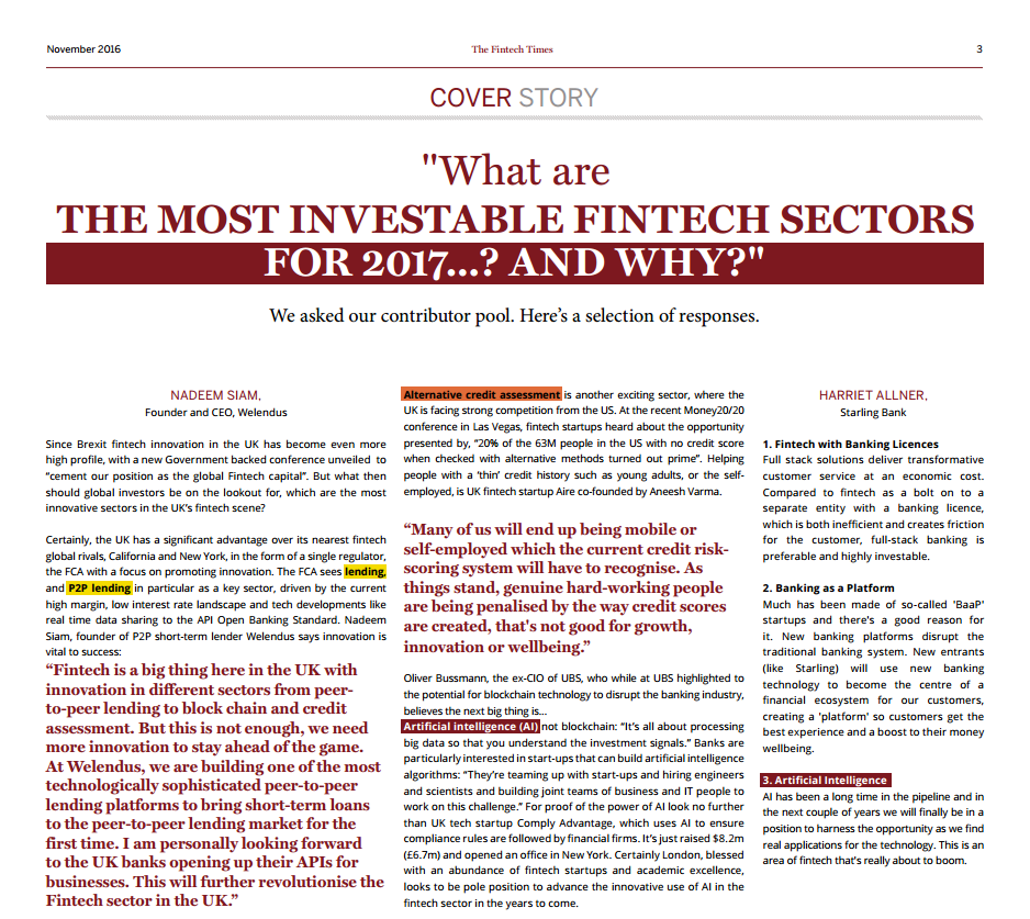 Welendus’s Founder and CEO Nadeem Siam with his fintech predictions for 2017, the leading cover story in the November edition of the Fintech Times: