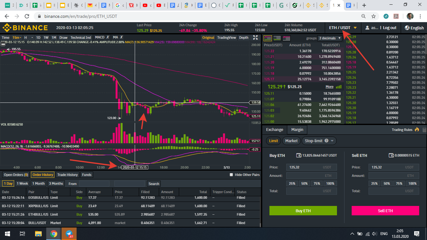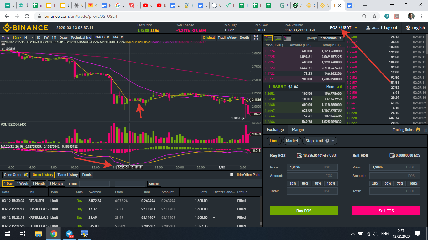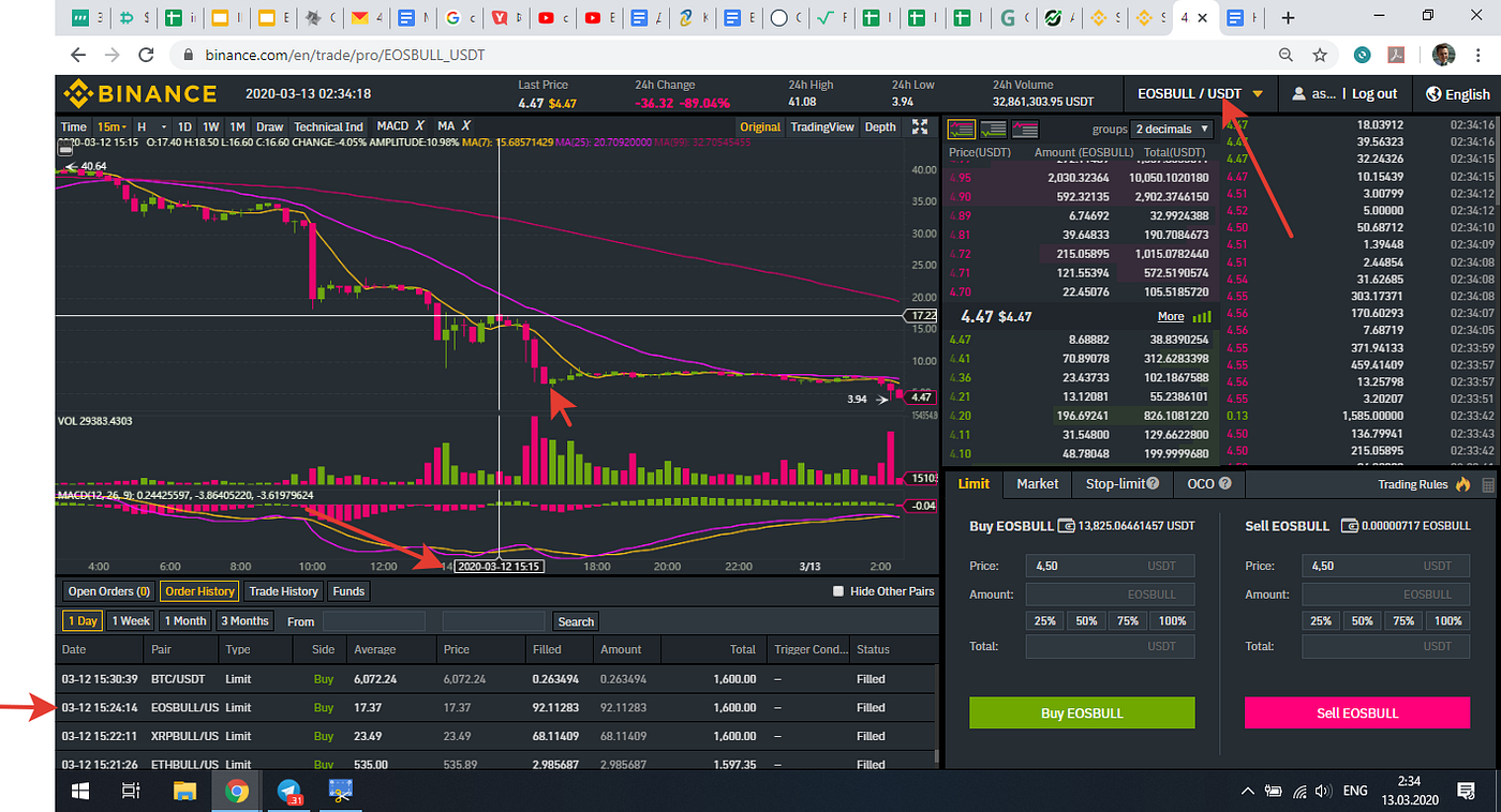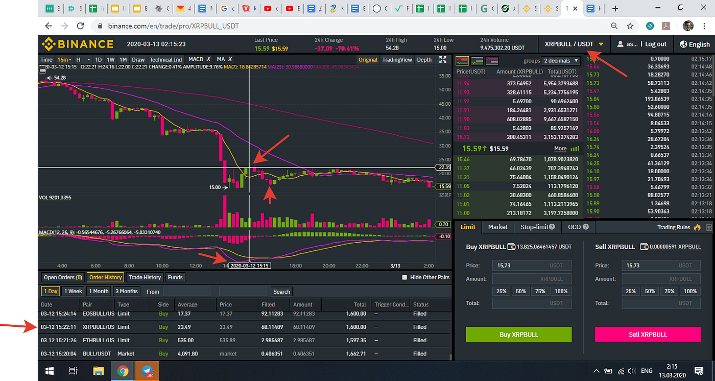 I was excited to use BULL tokens, as Binance assumes this tokens follow basis asset x3, if basic asset moves +1%, BULL token moves +3% (https://www.binance.com/en/support/articles/360038933471). So I opened positions in pairs: BULL/USDT, ETHBULL/USDT, EOSBULL/USDT, XRPBULL/USDT.