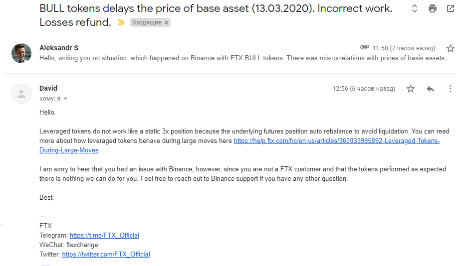 The worst thing is they knew such price miscorrelation could happen, they had such accidents in September 2019 (screen of FTX support answer also attached). But neither Binance who listed BULL/BEAR tokens 17/01/2020, nor FTX posted this precaution. If Binance took care of its users they could stop trading BULL tokens till they come back in right correlation with basic assets, or at least post note about possibility of such problem.