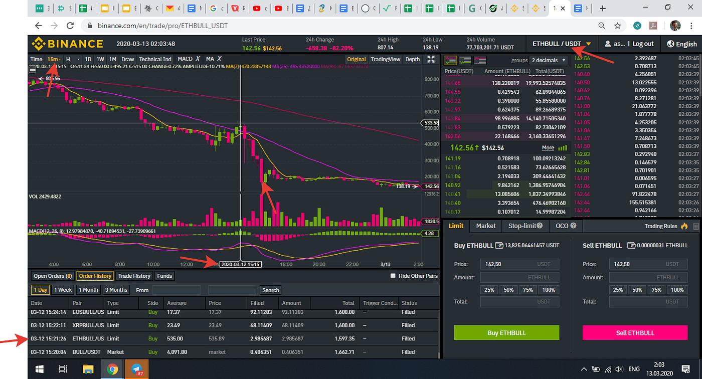 On March 13th after great dump which, I decided to start forming position about 15:00 as the priced calmed a while down. For the last month I used BEAR tokens very productively, so at last it came time for BULL ones .