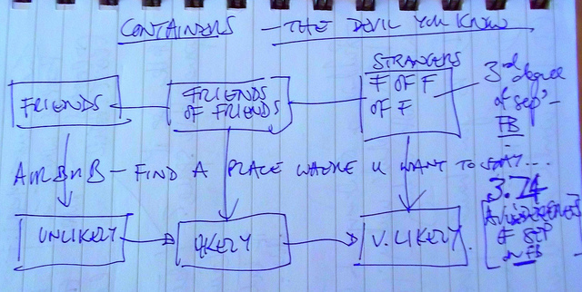 In trying to find somewhere to stay you are first going to see if any of your ‘friends’ live in the city you are visiting (the idea behind Airbnb is providing cheap places for people to stay in other people’s homes). But the chances they have a room in that city are ‘unlikely’ as your friendship network is relatively small. So you turn to ‘friends of friends,’ and they are ‘likely’ as they are my the virtue of wider geo-distribution going to have a possible place to stay. But maybe the night you want to stay they are busy? So the next container along, which for the sake of 3rd degree of separation symmetry I’ve called ‘friends of friends of friends’ is very likely to provide the room you want, and for the time/date you want. (It’s a nice fact that the average user on Facebook is connected to everyone else by 3.74 degrees of separation, so you can see why Facebook based commerce using the social graph is so potentially powerful).