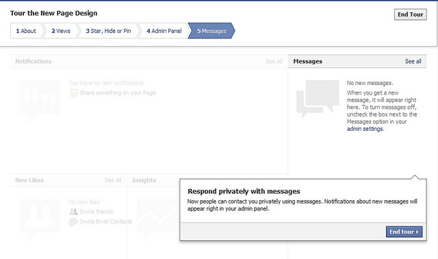 3. Admin Controls: “A new admin panel will appear at that the top of all brand pages you administer, giving you a snapshot into recent activity on the page. Brands will also be able to private message fans, meaning Facebook can be used more powerfully as a customer service tool. You won’t be able to initiate messages, but users can now message a brand page and page administrators can message them back. This is great news for community managers who are always looking for new ways to communicate with fans, particularly when fans’ issues involve private information like credit card orders, etc.”